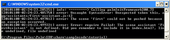 Note that the 2nd line of the results shows an error. (The first line simply indicates the start of your application.) Specifically, it complains that something unexpected is occurring at line 12. Wait, line 12? We removed the { from line 10, so why is line 12 reported as the problem? This is due to the fact that the WebOS doesn't realize there is a problem until line 12. It is expecting to see the { character, but when it gets to line 12, it sees that you're trying to set a variable. Since there isn't a { character before the variable is defined, it can't display this scene. (The next error in the results.)